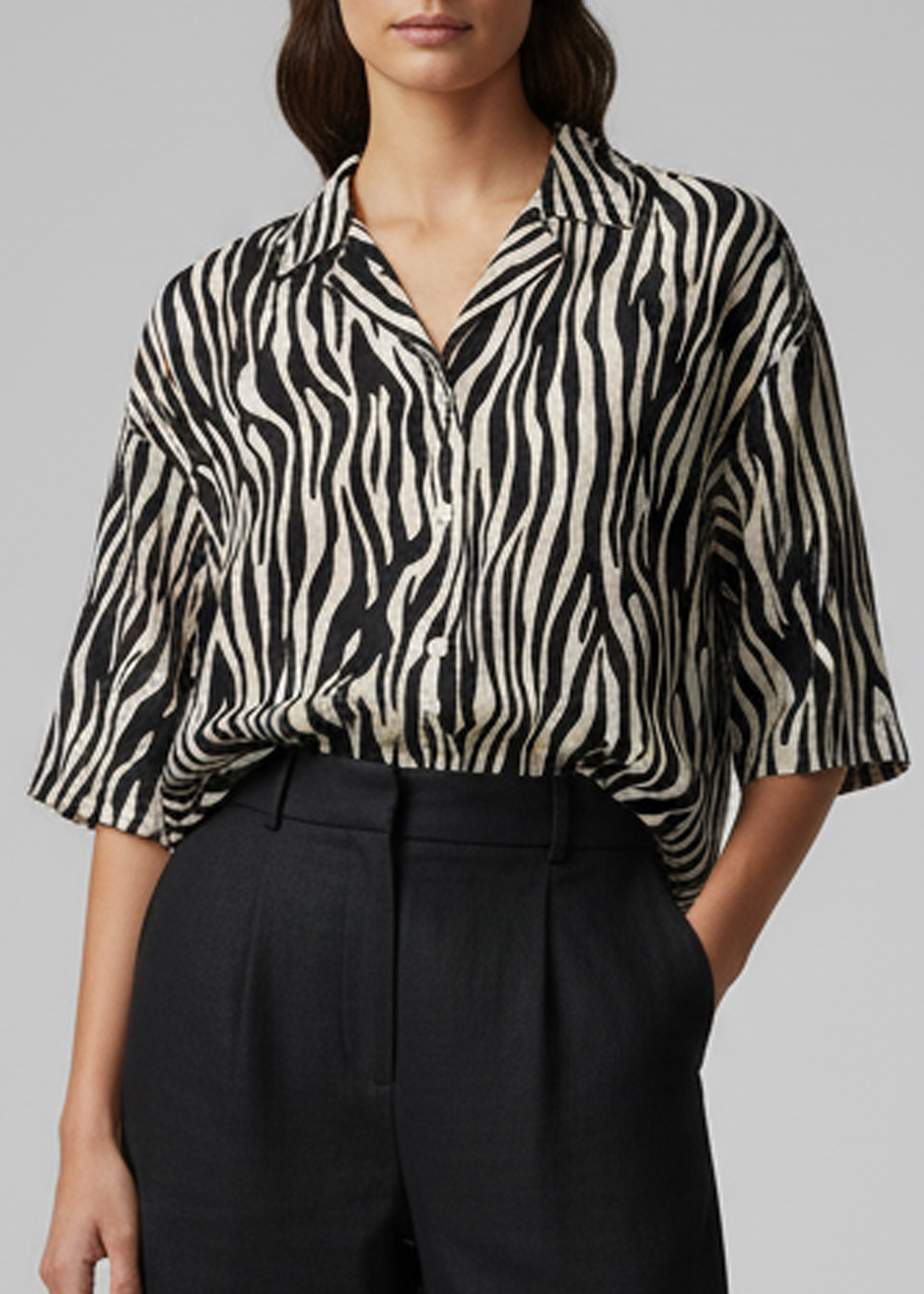 این شومیز را با شلوار مشکی ساده یا دامن میدی مونوکروم همراه کنید تا طرح زبرا مرکز توجه باشد. برای کفش، صندل مشکی یا سفید کافی است، و یک گردنبند نازک مینیمال یا عینک آفتابی جسورانه، استایل شما را کامل می‌کند!